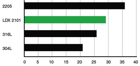 The enhanced mechanical strength of LDX 2101 is far superior to conventional 300 series stainless steels enabling it to be used in thinner cross-sections which can provide significant cost savings to the end user.