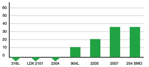 The following chart compares the PREN for LDX 2101 with other common stainless steels.