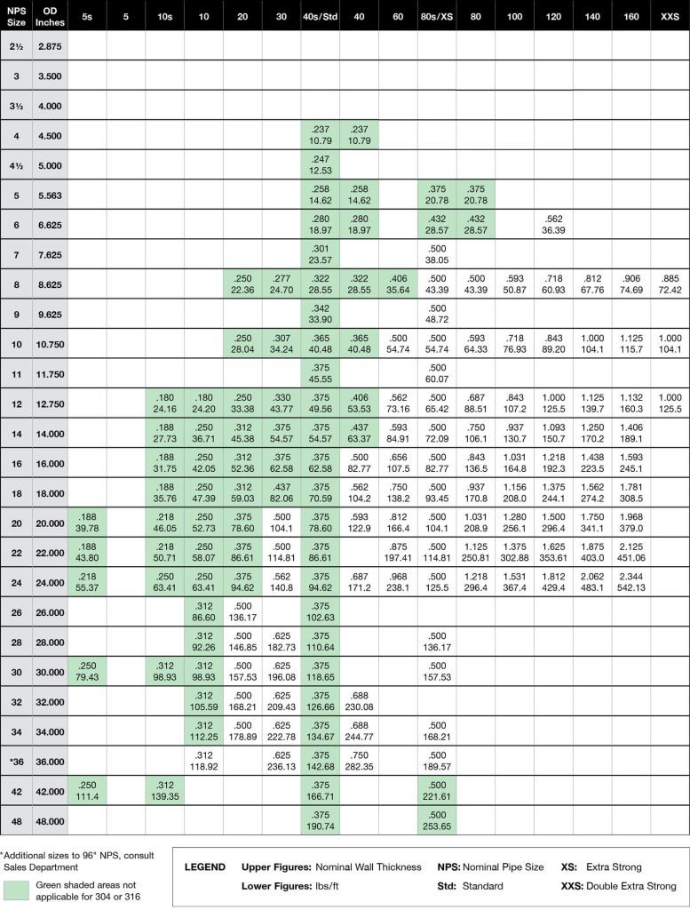 - Pipe: 4″ NPS through 48″ NPS, schedule 5 through 160